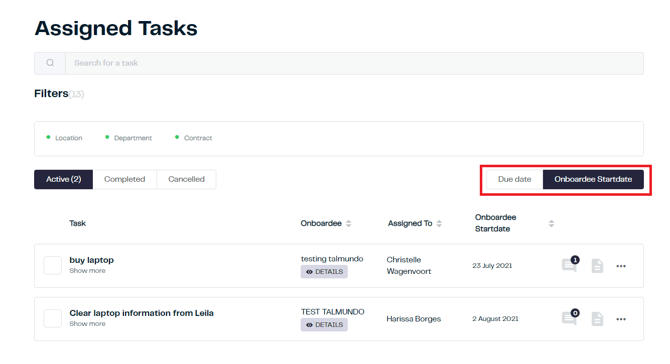 I øjeblikket kan du filtrere efter forfaldsdato og startdato for onboardee.