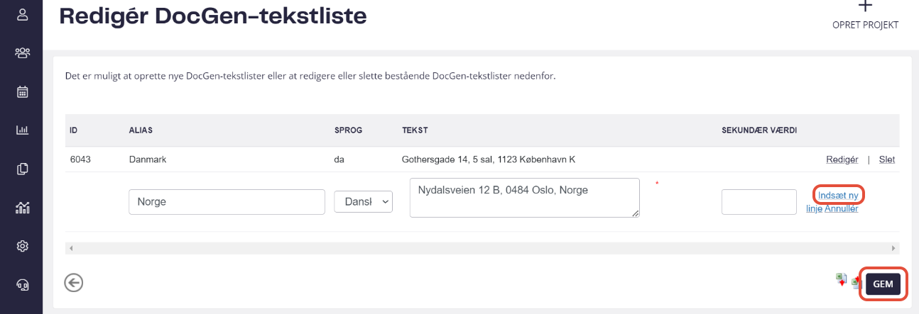 I kan nu redigere den pågældende kontrakt, vælge det ønskede flettefelt, f.eks. Virksomheds adresse, vælge 'DocGen-Tekstliste' og vælge den oprettede liste.