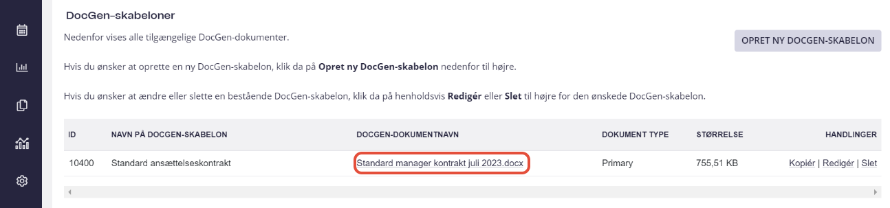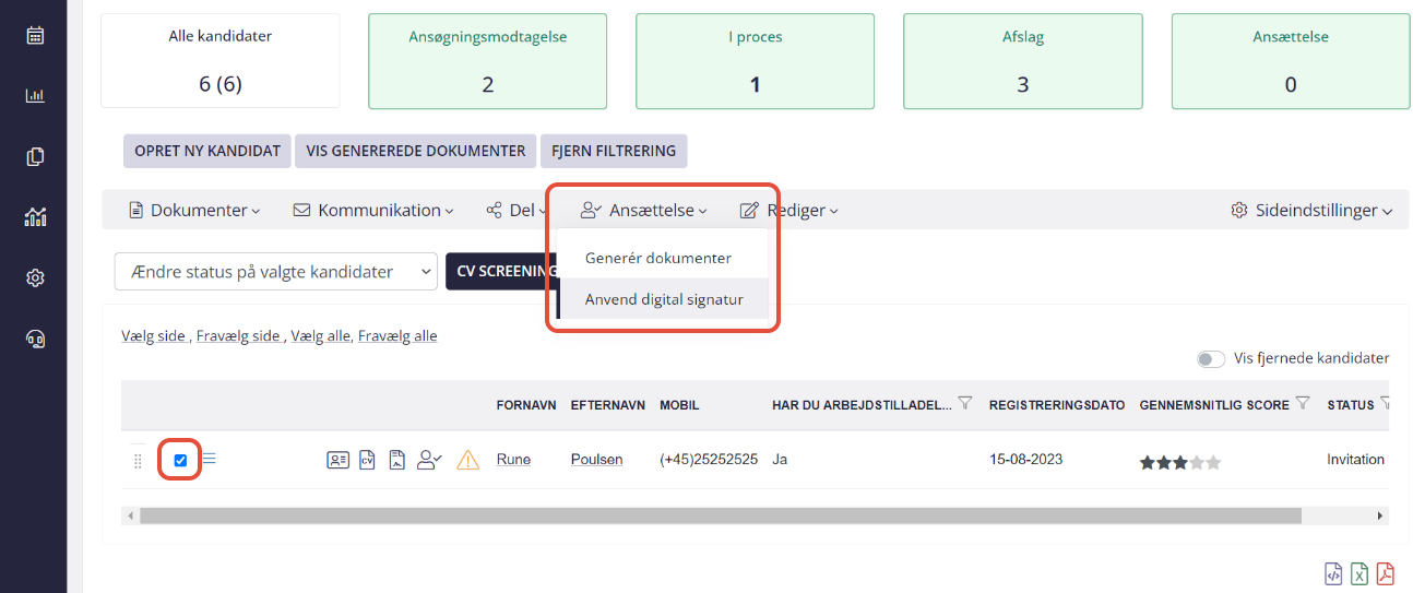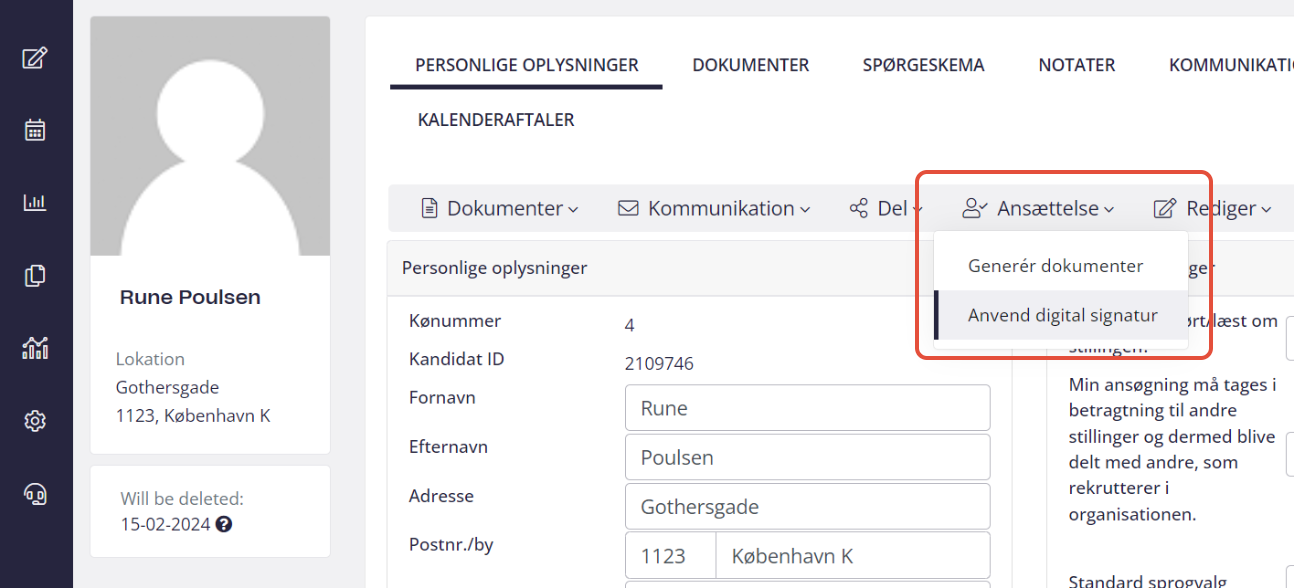 Når først I har uploadet jeres kontrakter i DocGen-dokumenter, og jeres Digital Signatur aftale er sat op, kan I generere kontrakter på kandidater og sende disse til underskrift. Dette gøres ved: