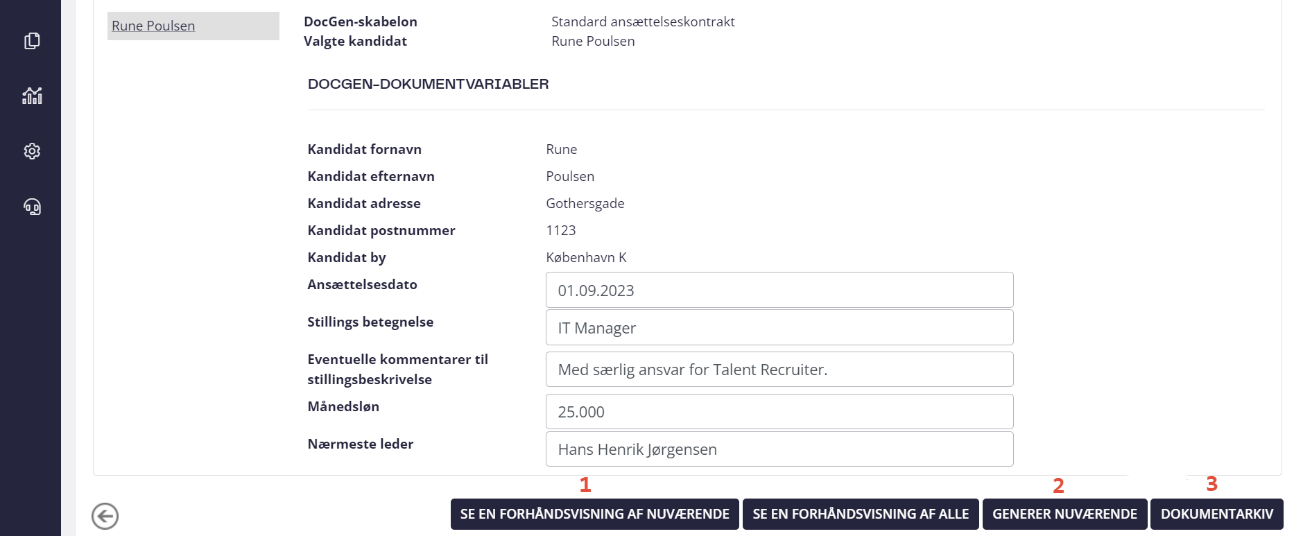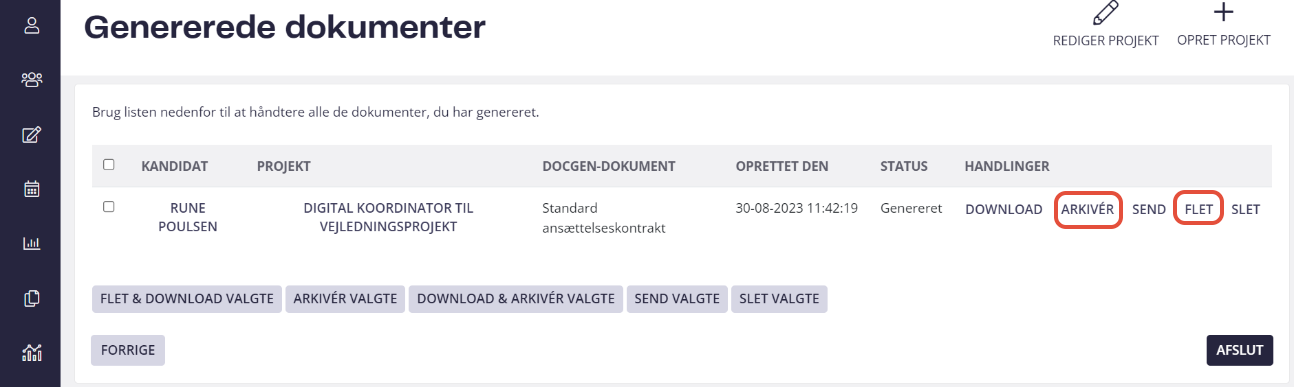 Kontrakten ligger nu i dokumentarkivet, hvor det er muligt at flette den sammen med flettedokumenter for herefter at arkivere den, eller blot at arkivere den på kandidatens profil uden flette dokumenter.