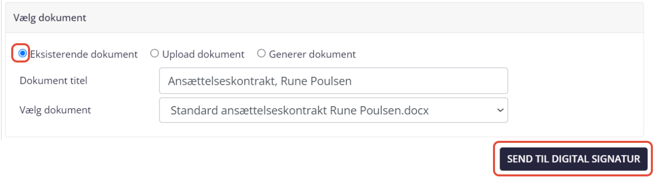 - Nederst er det muligt at vælge 'Eksisterende dokument' hvor den tidligere genererede kontrakt, inklusiv flettedokument, ligger