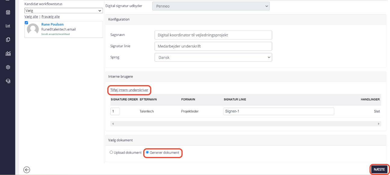 Kontrakten sendes nu afsted, først til de interne underskrivere, og herefter til kandidaten. Den underskrevne kontrakt gemmes på kandidatens profil under fanen: 'Dokumenter'.