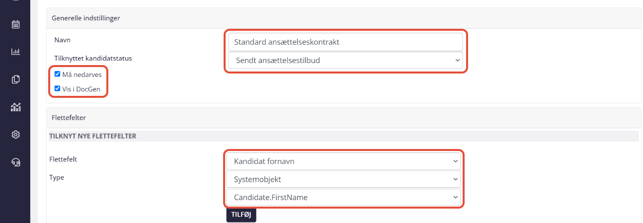 For at sætte DocGen og Digital Signatur op kræves brugerrollen: 'Administrator'. I administrationsmodulet: 'DocGen-dokumenter' uploades jeres kontrakter. Forinden skal I oprette flettefelter i kontrakten og når kontrakten uploades mappes disse flettefelter op. Dette gør f.eks. at kandidatens navn kan komme automatisk ind i kontrakten. I administrationsmodulet: 'Digital Signatur' laves jeres opsætning ifm. signering af dokumentet. Denne opsætning kan kun foretages af en Talentech-konsulent. For at kunne sende til Digital Signatur skal I have en signerings aftale, hvor vi har flere muligheder. Er I interesseret I at høre mere, er I meget velkomne til at kontakte vores support som kan hjælpe jer videre (oplysninger finder I nederst på denne side).