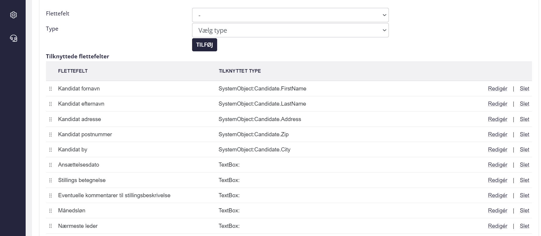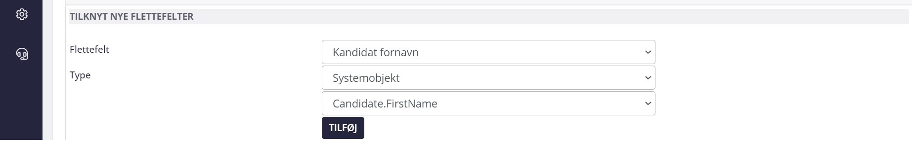 Begynd nu at vælge hvert flettefelt på dropdown-listen, for herefter at mappe det op med den rette information på type-listen. Kandidatens fornavn skal f.eks. mappes op med: Systemobjekt, og informationen: Candidate.Firstname (se eksempel nedenfor).