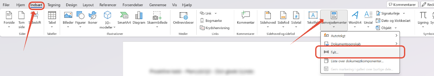 Det markerede sted i dokumentet har herefter ændret sig til et ‘MergeField’/flettefelt med det ønskede navn.