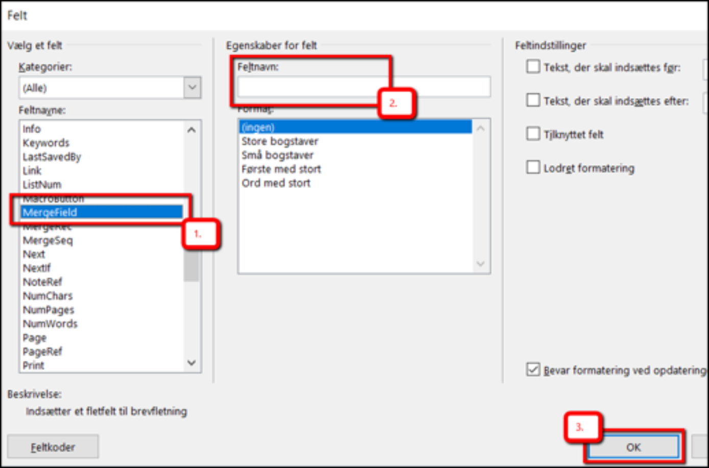 - Vælg ‘MergeField’ i Feltnavne (en genvej er at klikke to gange på 'm', i stedet for at scrolle ned på listen)