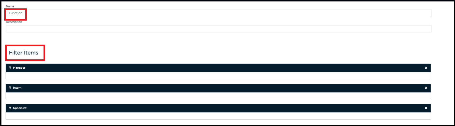 Eksempel: En ny filterkategori oprettes: Funktion. Denne kategori indeholder følgende elementer: Manager, Praktikant og Specialist.