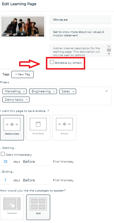 "Redigerbar af andre" ikke markeret: Under oprettelsen af en læringsside kan den ansvarlige vælge, om feltet "Redigerbar af andre" skal markeres. Hvis dette felt ikke er markeret, er det kun skaberen af indholdet, der kan redigere det. Læs artiklen Hvad gør afkrydsningsfeltet "redigerbar af andre"? for at forstå denne funktion bedre.