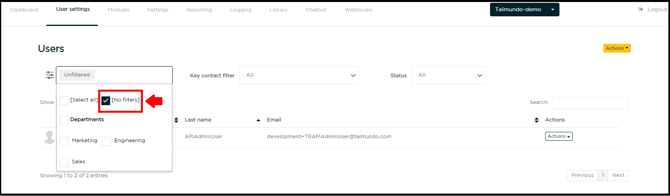 1. Når du er i brugernes eller nyansattes side, så vælg "ingen filtre" i filterboksen.