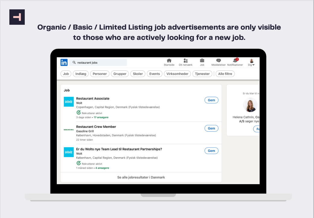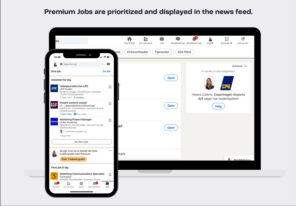 Når du publicerer til LinkedIn Premium, når du ud til relevante kandidater, som ikke aktivt søger efter et nyt job og derfor ikke ser på jobportaler. LinkedIn Premium placerer din stilling foran folk, som måske ikke søger, men kan genkende en god mulighed, når de ser den.