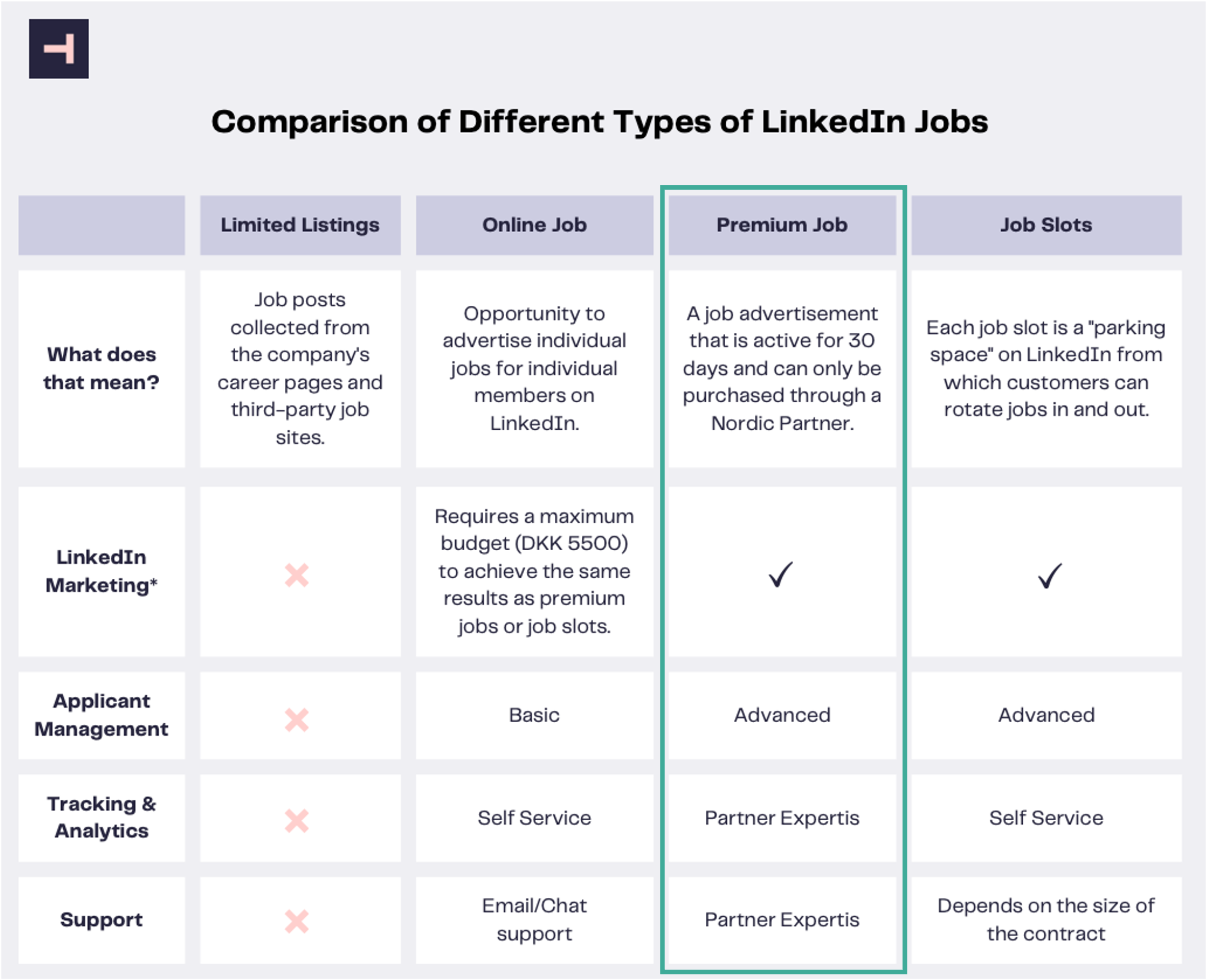 | Resultatet af annoncering kan variere afhængigt af årstid og annonceindhold og et bestemt antal visninger eller ansøgninger kan ikke garanteres. Gennemsnitligt får vores kunder cirka 26 gange flere ansøgere, når de anvender LinkedIn Premium (sammenlignet med "limited listing"), men vi kan ikke garantere et specifikt antal ansøgere af de ovenfor angivne årsager. |