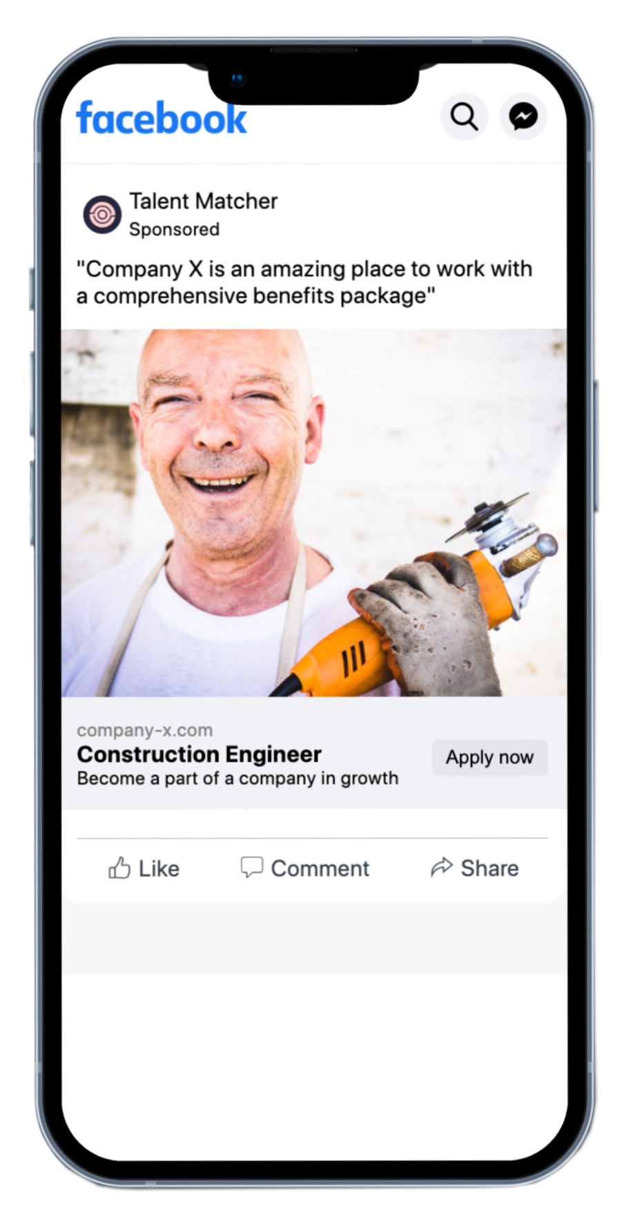 Ved at annoncere gennem Social Media Ads, når du ud til relevante kandidater, som ikke aktivt søger et nyt job og derfor ikke kigger på jobportaler. Social Media Ads placerer din stilling foran folk, som ikke er aktivt søgende, men som kan genkende en god mulighed, når de ser den.