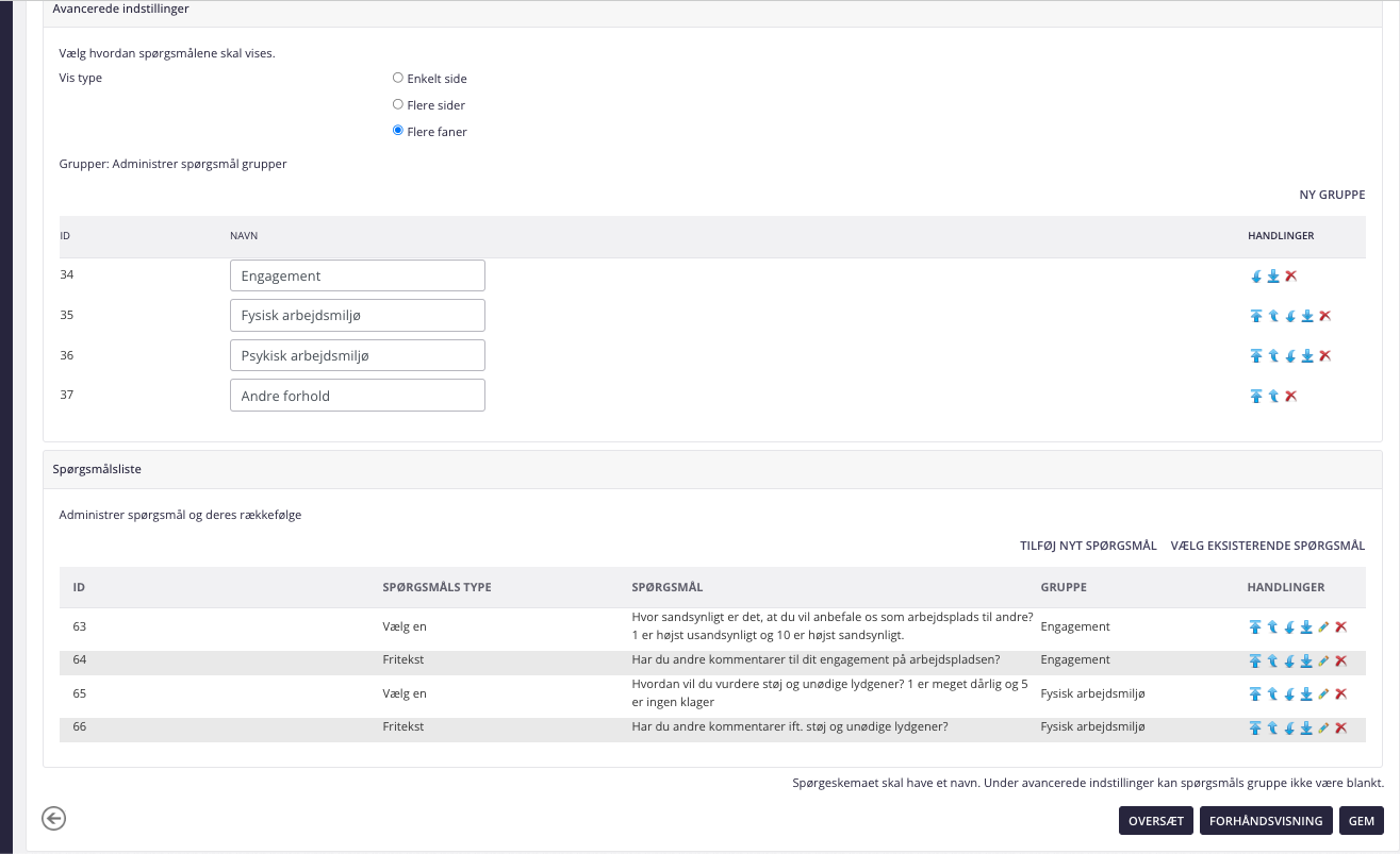 Herefter opretter I jeres survey på samme måde som ved oprettelsen af et almindeligt spørgeskema. Dog vil man kun kunne vælge mellem to spørgsmålstyper: vælg en + fritekst. Når spørgeskemaet er oprettet, vil I kunne oprette jeres survey i modulet Survey.