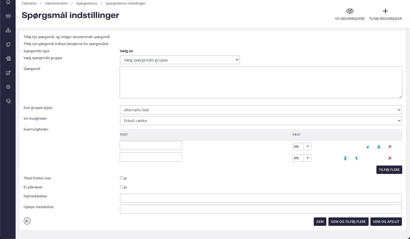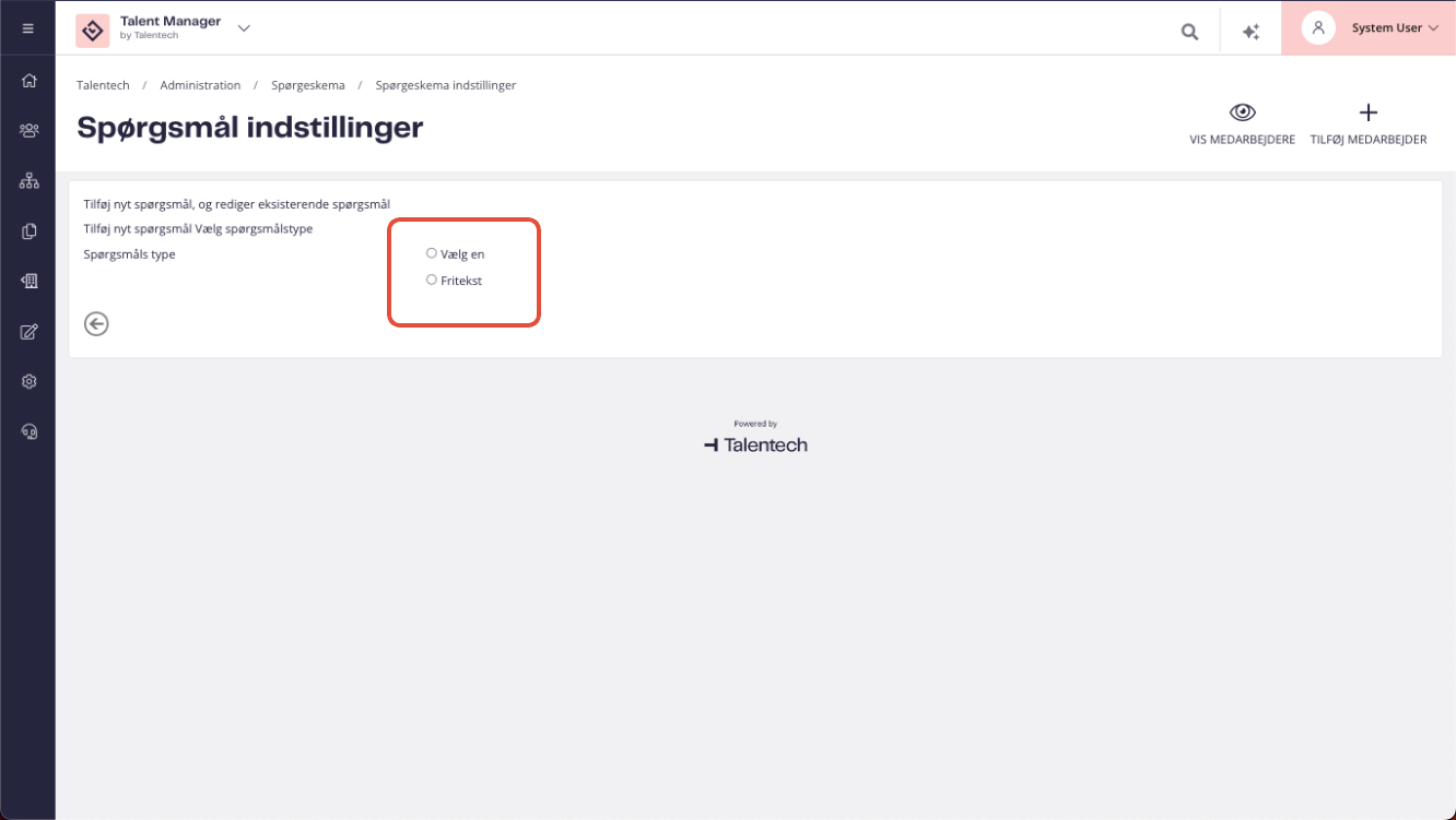 Survey forudsætter, at I først tilgår modulet spørgeskema og opretter et spørgeskema af typen Survey, inden, at der kan oprettes en survey i Talent Manager.