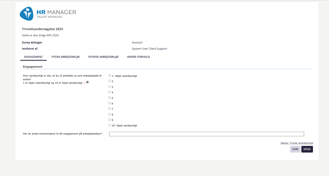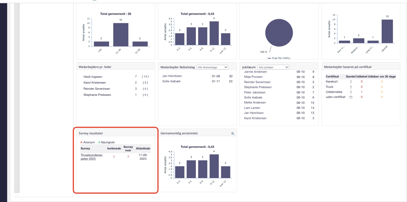 Survey gør det muligt for jer at oprette en survey, såsom Arbejdspladsvurdering (APV) og udsende denne til alle medarbejdere i virksomheden eller kun til en bestemt afdeling i virksomheden. I opsætningen af survey definerer I, om besvarelsen af surveyen skal være anonym eller navngiven, samt i hvilken periode, at surveyen skal udfyldes.