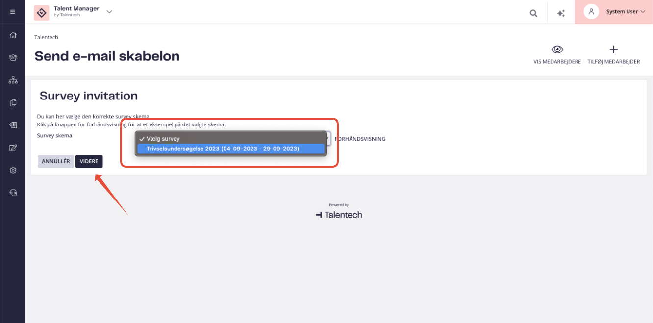 - Klik ”Send” for at sende invitation til survey til valgte medarbejdere