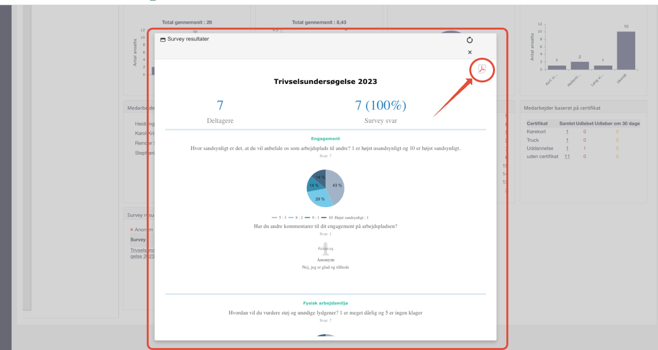 Efter denne periode vil en administrator kunne udtrække en rapport over medarbejdernes besvarelse i Excel, mens en leder kan få en oversigt over besvarelsen af surveyen på sit dashboard, som senere kan konverteres til PDF.