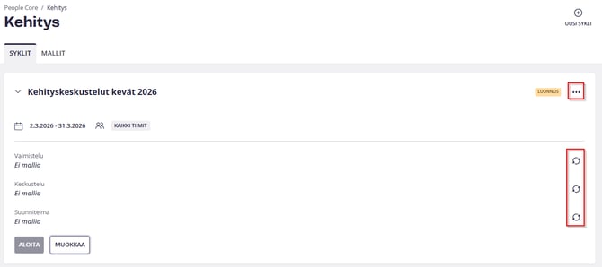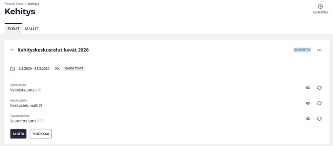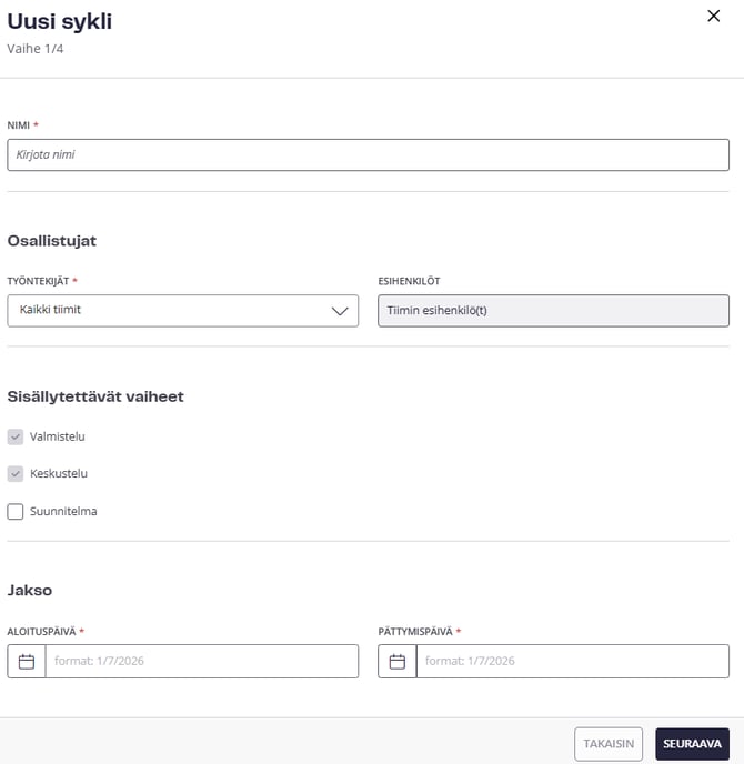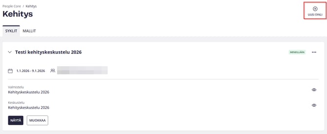 - Nimeä sykli: Anna syklille tunnistettava nimi, esimerkiksi ”Kehityskeskustelut kevät 2026”.