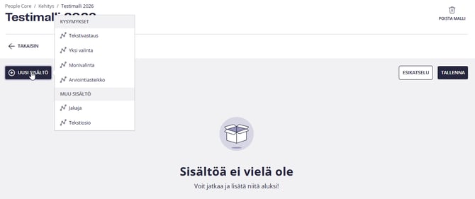 Täällä voit rakentaa omia malleja käyttämällä erilaisia kysymystyyppejä ja sisältökenttiä. Jos kaipaat inspiraatiota, tutustu Talentechin tarjoamiin parhaiden käytäntöjen malleihin.