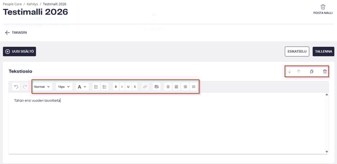Tekstieditorissa voit muotoilla tekstiä, lisätä kuvia ja paljon muuta. Voit myös muuttaa kysymysten järjestystä nuolien avulla sekä kopioida tai poistaa kysymyksiä.