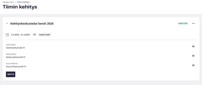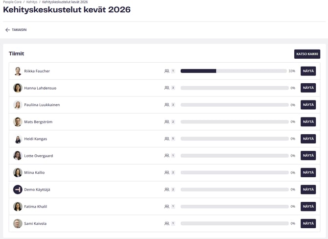 Kun sykli on julkaistu ja esihenkilöt ovat aloittaneet prosessin tiimiensä kanssa, pääkäyttäjät voivat seurata tilannetta napsauttamalla ”Näytä” haluamansa syklin kohdalla Kehitys-välilehdellä.