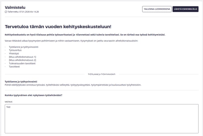 Kun työntekijä napsauttaa ”Avaa”, hän pääsee näkymään, jossa täytetään vastaukset kehityskeskustelun valmistautumiskysymyksiin. Hän voi valita ”Tallenna luonnoksena” ja viimeistellä vastaukset myöhemmin tai ”Lähetä esihenkilölle”, jolloin valmistautuminen merkitään valmiiksi.