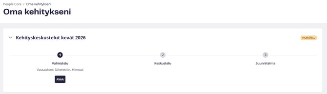Kun työntekijä on valmistautunut keskusteluun ja lähettänyt vastauksensa esihenkilölle, tila muuttuu osoittamaan, että työntekijä on suorittanut tämän vaiheen ja on esihenkilön vuoro valmistautua.