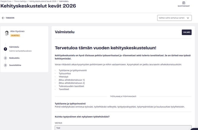 Tässä vaiheessa esihenkilö on ohjaajan paikalla ja täyttää mallin People Coressa. Tämä on suositeltavaa tehdä varsinaisen kehityskeskustelun aikana, jolloin esihenkilö voi käyttää keskustelumallia tapaamisen ohjenuorana. Esihenkilö pääsee käsiksi muistiinpanoihinsa milloin tahansa nähdäkseen valmistautumisvaiheen huomiot. Esihenkilö voi myös tarkastella työntekijän valmistautumista napsauttamalla ”Näytä”-painiketta valmisteluvaiheen kohdalta: