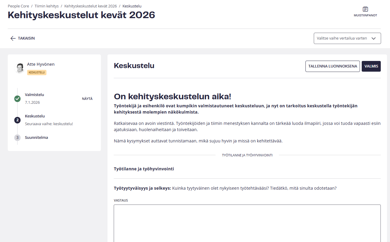 Tämän mallin täyttäminen voidaan tehdä vaiheittain tallentamalla luonnos ja palaamalla siihen myöhemmin. Kun esihenkilö on täyttänyt keskustelumallin, hän napsauttaa ”Valmis”, jolloin keskusteluvaihe merkitään suoritetuksi.