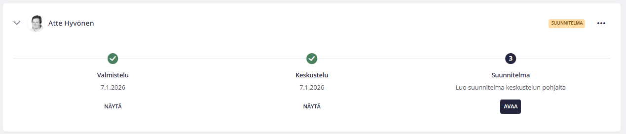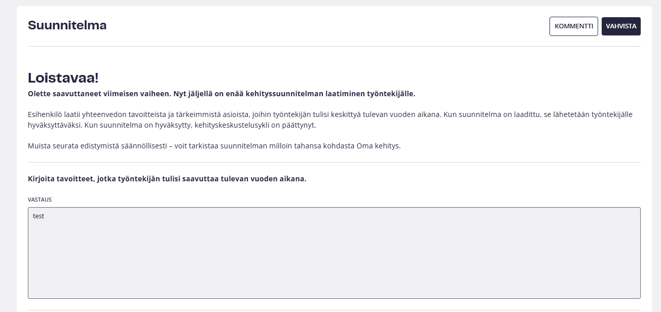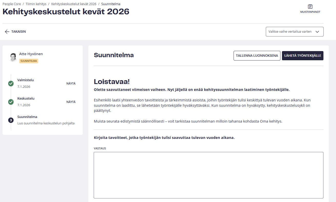 - Suunnitelma – valinnainen: Esihenkilö täyttää suunnitelmalomakkeen. Suunnitelman tulisi olla tiivis ja sisältää työntekijän kanssa yhdessä sovitut tavoitteet tulevalle kaudelle.