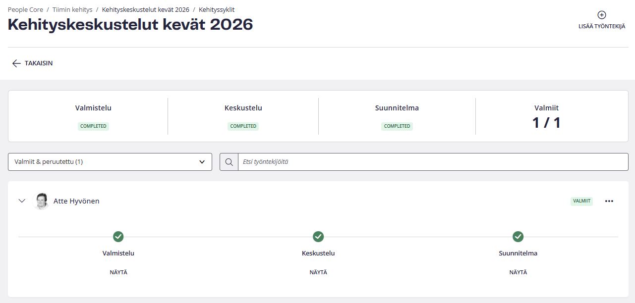 Jos pääkäyttäjä valitsi kehityskeskustelusykliin vain valmistautumis- ja keskusteluvaiheet, keskusteluvaiheen valmistuminen päättää syklin kyseisen työntekijän osalta. Jos myös suunnitelmavaihe on valittu, lue lisää alta.