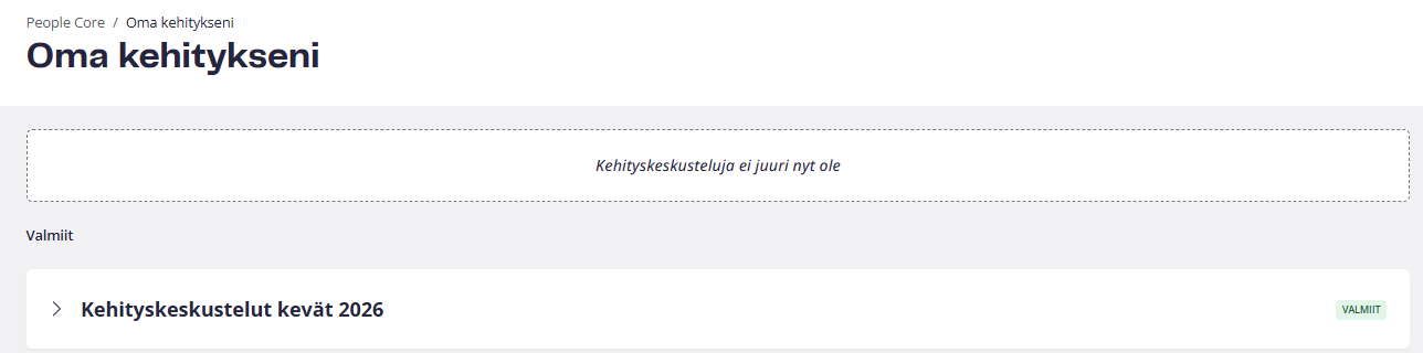 Kannustamme lämpimästi työskentelemään kehityssuunnitelman parissa työntekijöiden kanssa läpi koko vuoden. Työntekijät ja esihenkilöt pääsevät aina käsiksi kehityskeskustelujen suunnitelmiin valitsemalla oikean syklin ”Valmiit”-kohdasta ja tarkastelemalla muistiinpanoja.