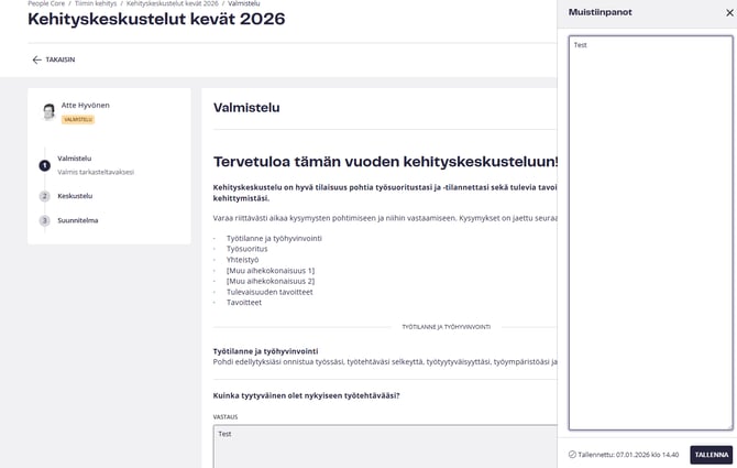 Kun työntekijä on valmistunut, esihenkilö avaa kyseisen vaiheen ja näkee työntekijän tekemät muistiinpanot. Esihenkilö voi nyt tehdä omia muistiinpanojaan työntekijän valmistautumisesta ja kommentoida asioita, joista hän on samaa tai eri mieltä. Tämä muistiinpano-osio kulkee esihenkilön mukana kehityskeskustelusyklin kaikissa vaiheissa, eikä se ole koskaan työntekijän nähtävissä.
