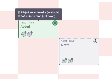 Kun osallistujat ovat synkronoineet kalenterinsa, järjestelmä ehdottaa vapaita aikoja ja näyttää, kuka on käytettävissä.