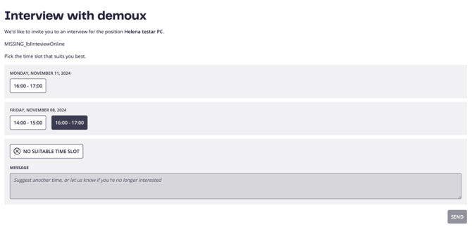ilmoittaa, jos sopivaa aikaa ei löydy, ja jättää kommentin rekrytoijalle
