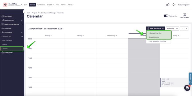 To pre-book interviews, users can go into the calender view on the project and prepare individual interviews or group interview: