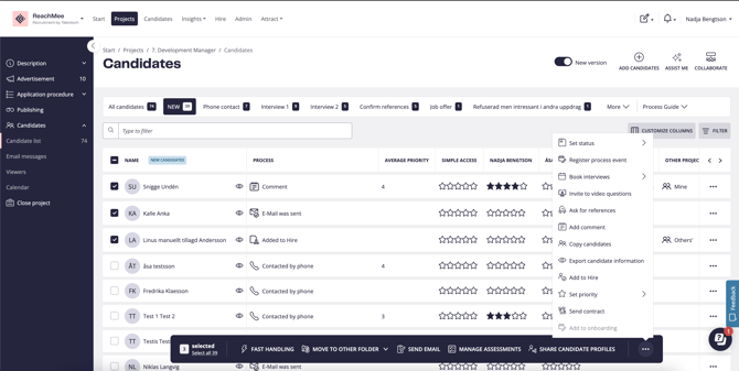 Select one or more candidates, click the more menu (three dots), go to Book interviews and select “Invite to existing interviews”: