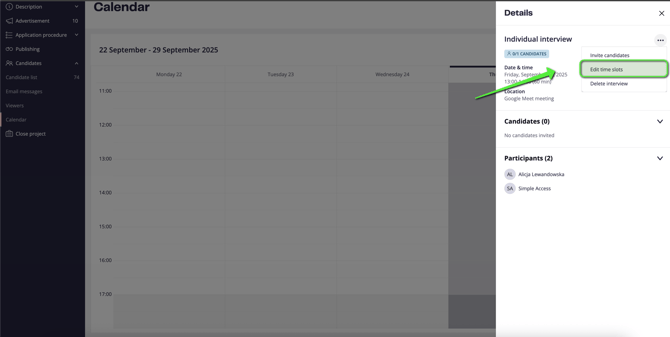 The timeslots you added, will now become available under “Invite to existing interviews”: