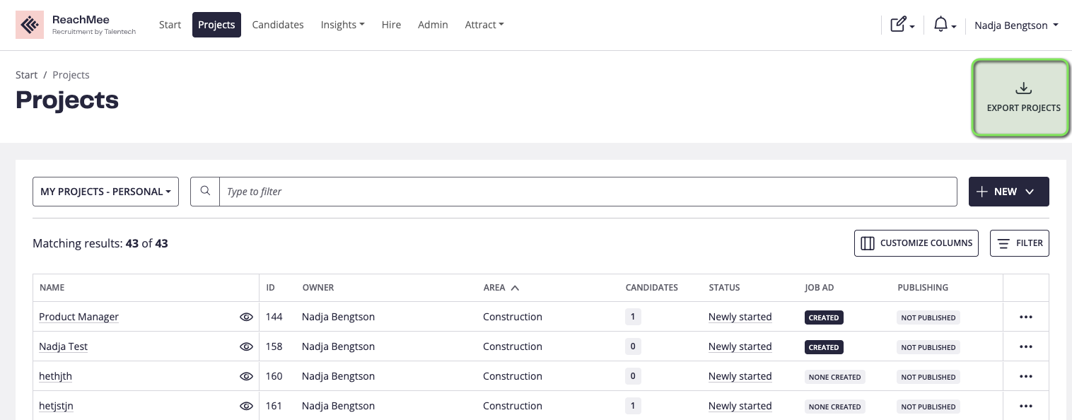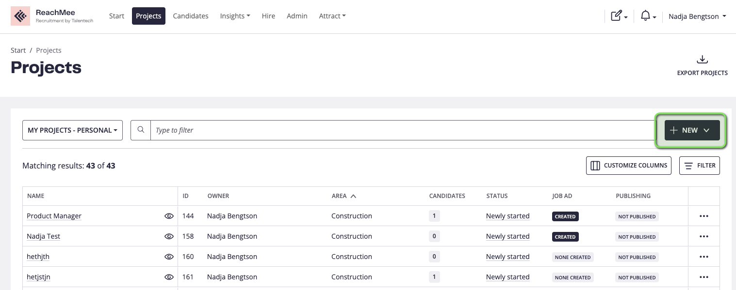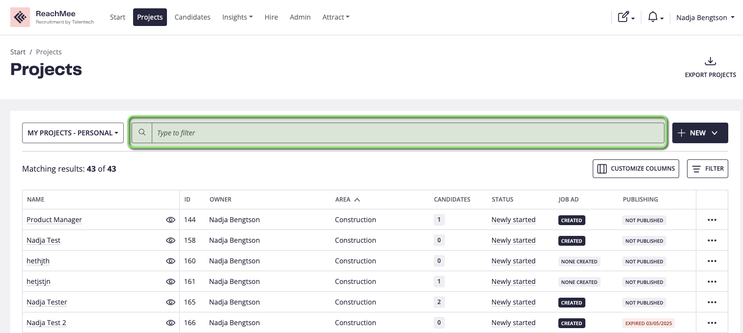 Projektlistan ger dig en vy över alla projekt som finns, samt ger dig möjlighet att skapa nya projekt, få en snabb överblick, filtrera, söka och hitta vad du behöver i ReachMee.