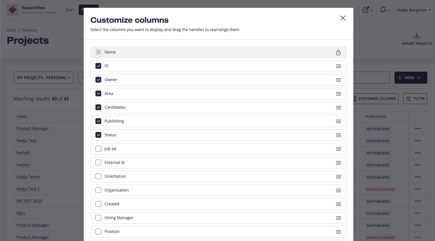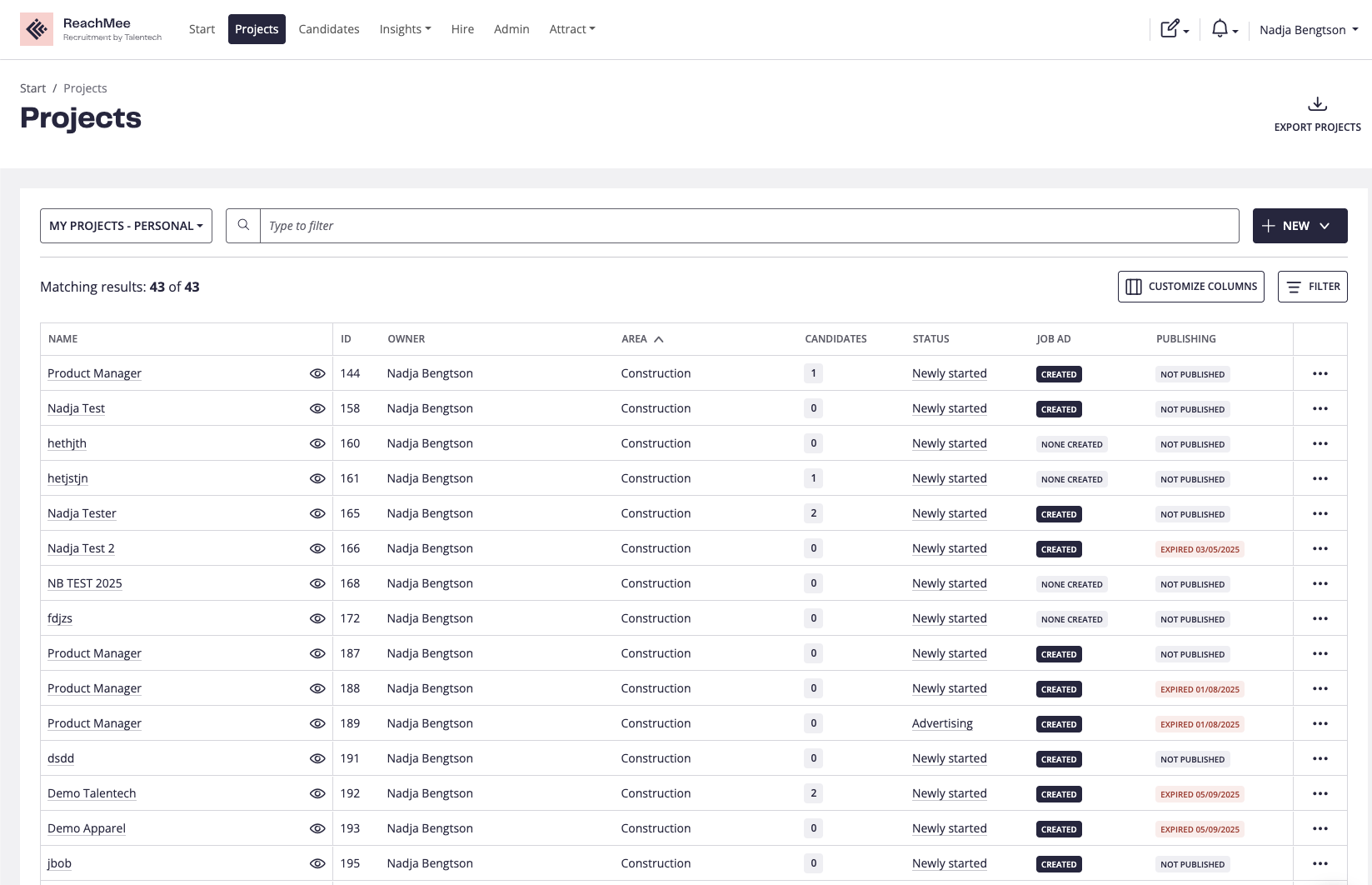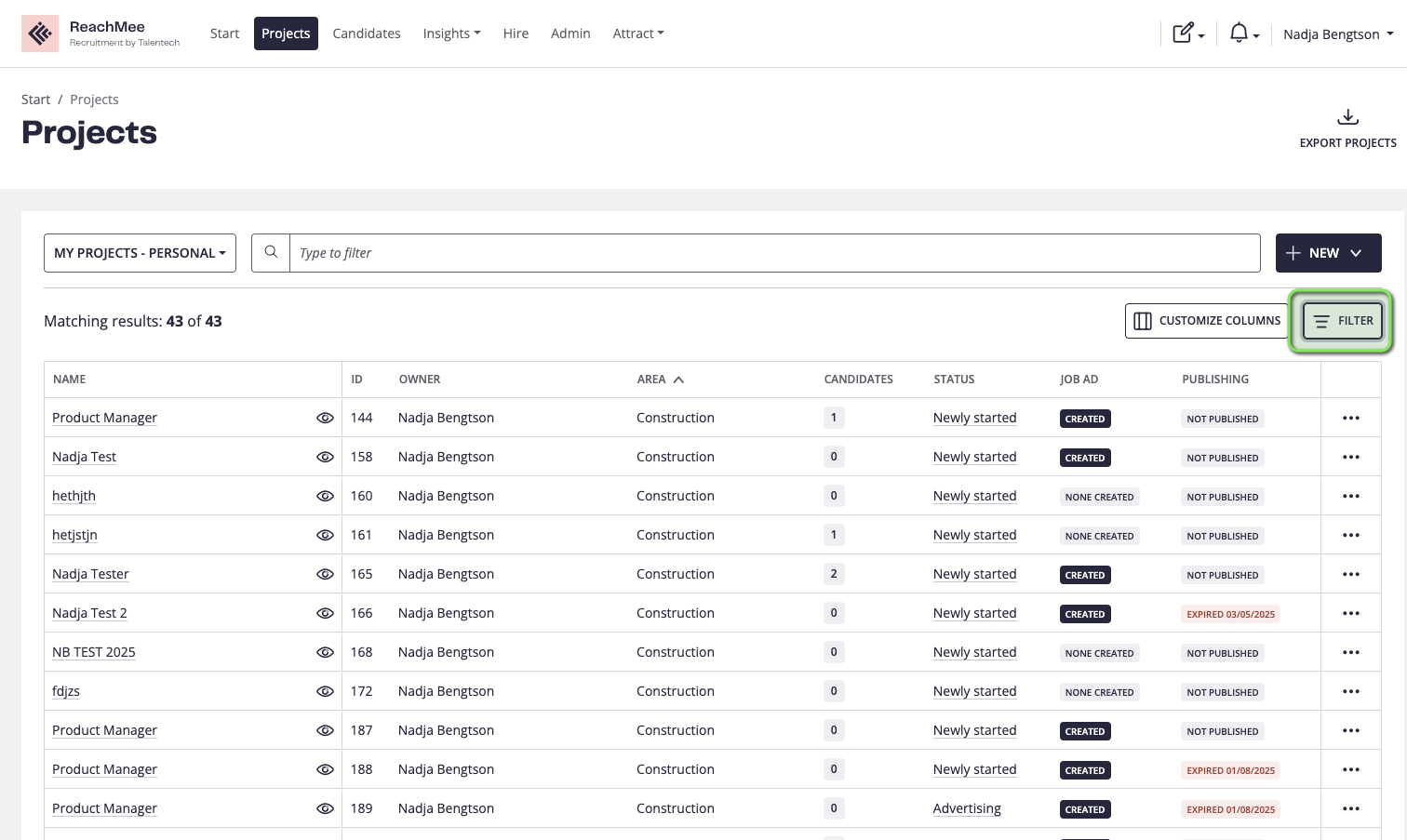Projektlistan ger dig en vy över alla projekt som finns, samt ger dig möjlighet att skapa nya projekt, få en snabb överblick, filtrera, söka och hitta vad du behöver i ReachMee.
