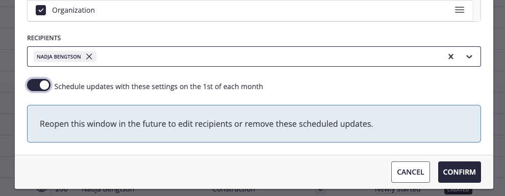 Under "mottagare" kan du välja vem som ska få exporten, och på knappen under kan du ställa in så att exporten skickas till mottagaren den 1:a varje månad.