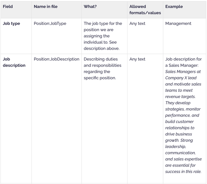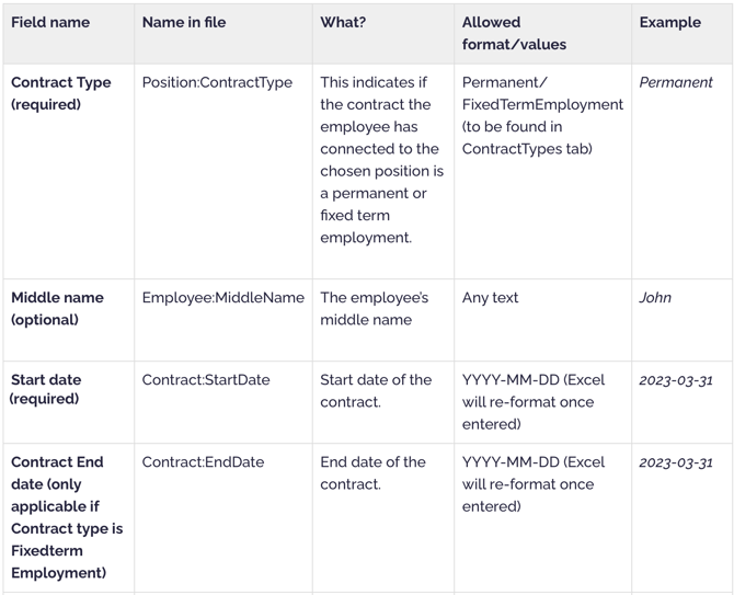 Now follows a detailed instruction on how to successfully fill in each column, divided in the categories Employee, Position and Contract: