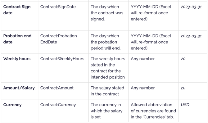 At the bottom of the sheet, you’ll find tabs with different names. They are connected to the columns with adjacent name and there you can find the accepted values to choose from. For instance, under ContractTypes we only accept Permanent or FixedTermEmployment: